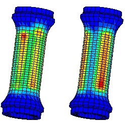 This page shows the results for a tension-torsion test specimen made of a FCC single crystal material. The material is modeled with cubic elasticity, and viscoplastic deformation on its 12 octahedral and 6 cubic slip systems. Each slip system allows kinematic hardening (scalar with sign) and isotropic hardening (scalar).